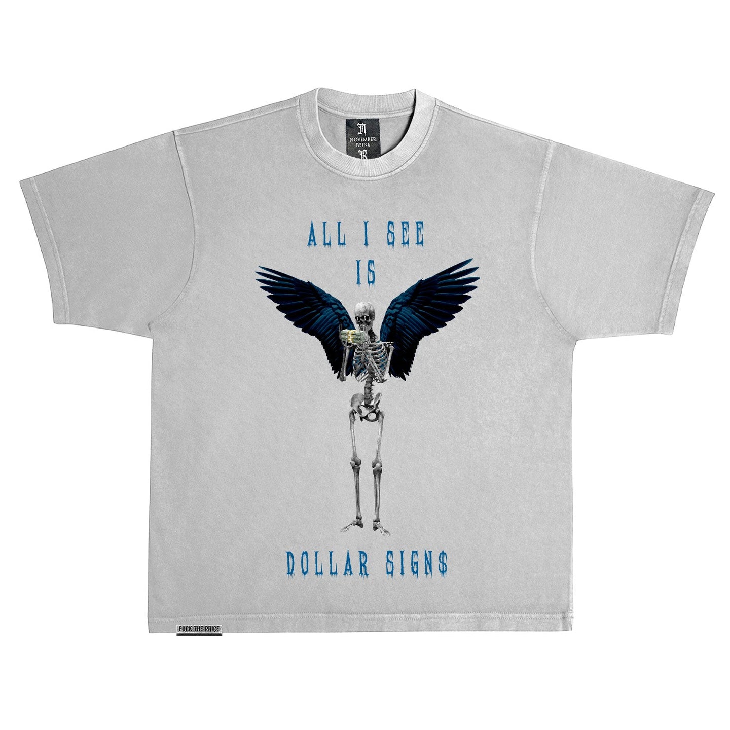 November reine (White/Pewter Blue "Dollar Signs" t-shirt)