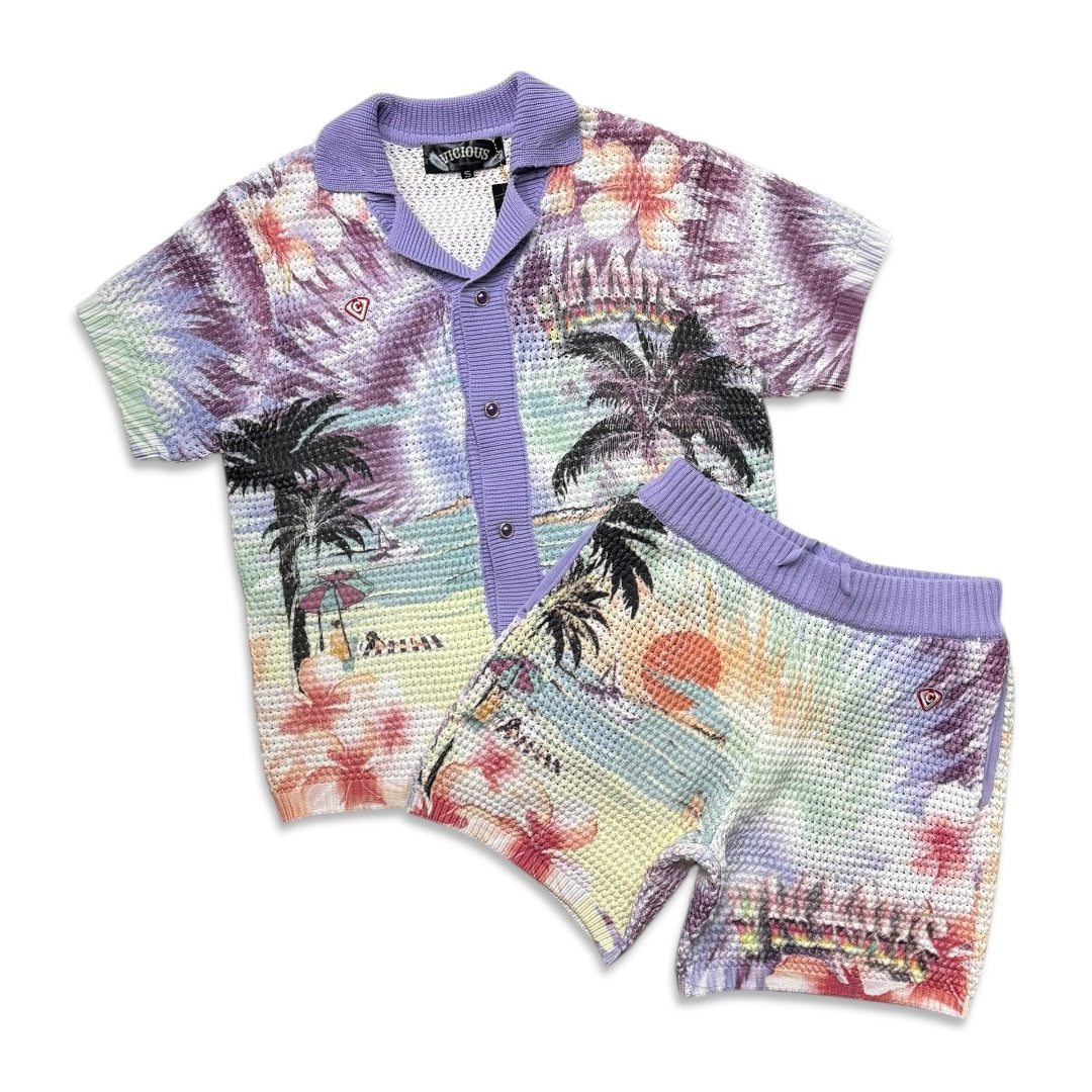 Vicious Denim Knitted Crochet Button Down Short Set – Blue/Pink
