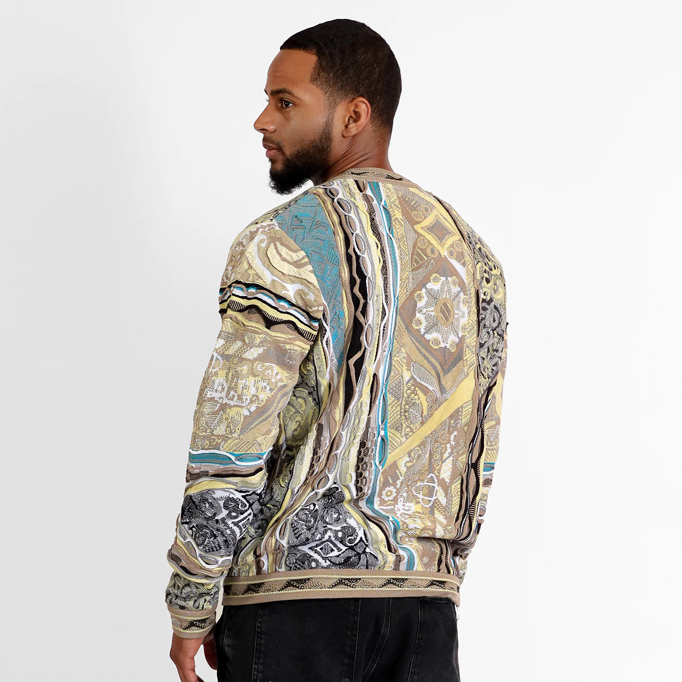 Knit in 100% mercerized cotton, the crew neck features detailed fabric composition by COOGI’s custom knitting machines. Kaleidoscopic patterns are paired with raised textures to deliver a one of a kind aesthetic. Elasticized waistband and sleeve cuffs are the finishing touches on this unique garment which has a new contemporary slim fit.