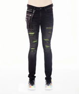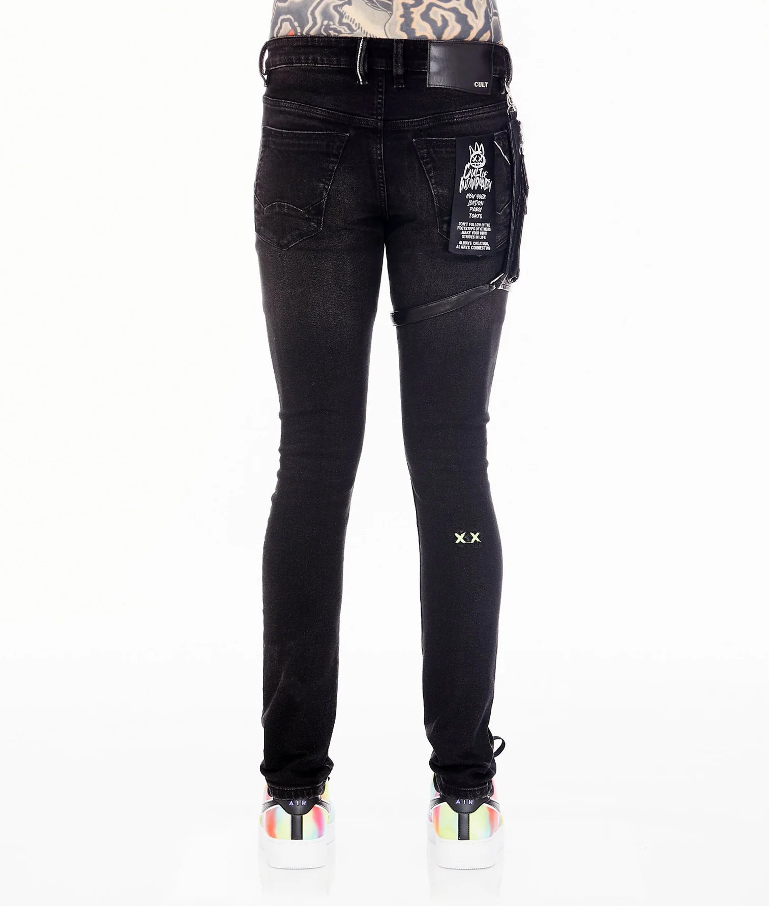 This black stretch punk super skinny style has a narrow leg from thigh to ankle. Crafted from premium stretch denim then vintage washed with rips and repairs and backed with safety green crystals for a clean design. It features a cult vegan leather hip pouch and signature selvedge trim details and XX" embroidery on the back leg.