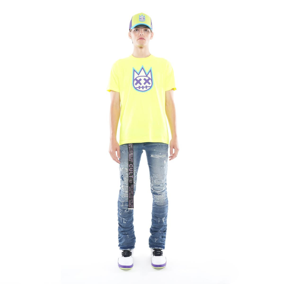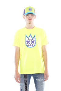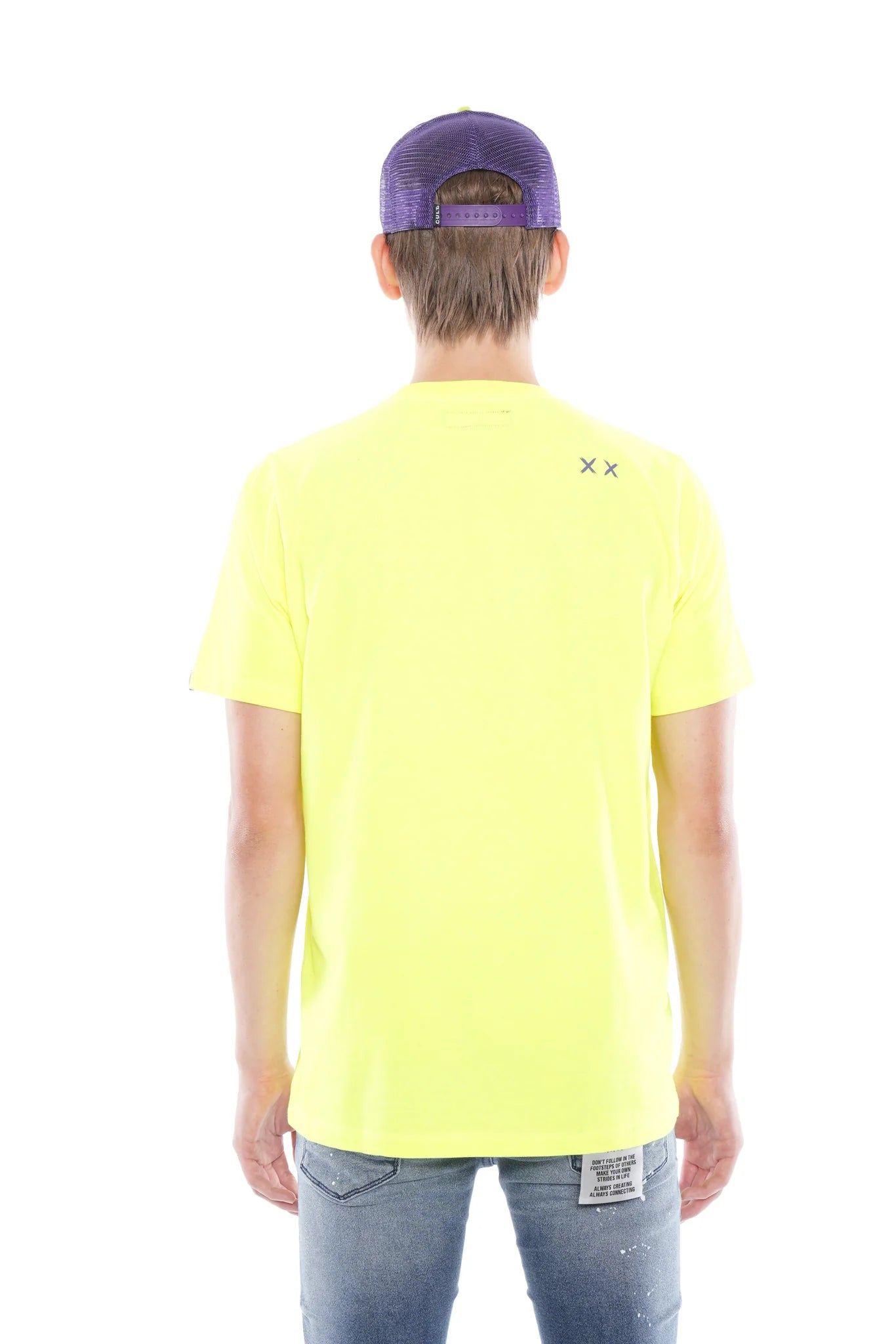 This highlighter yellow cotton tee features a large 3D Shimuchan logo on the front and Cult signature "XX" printed on the back.