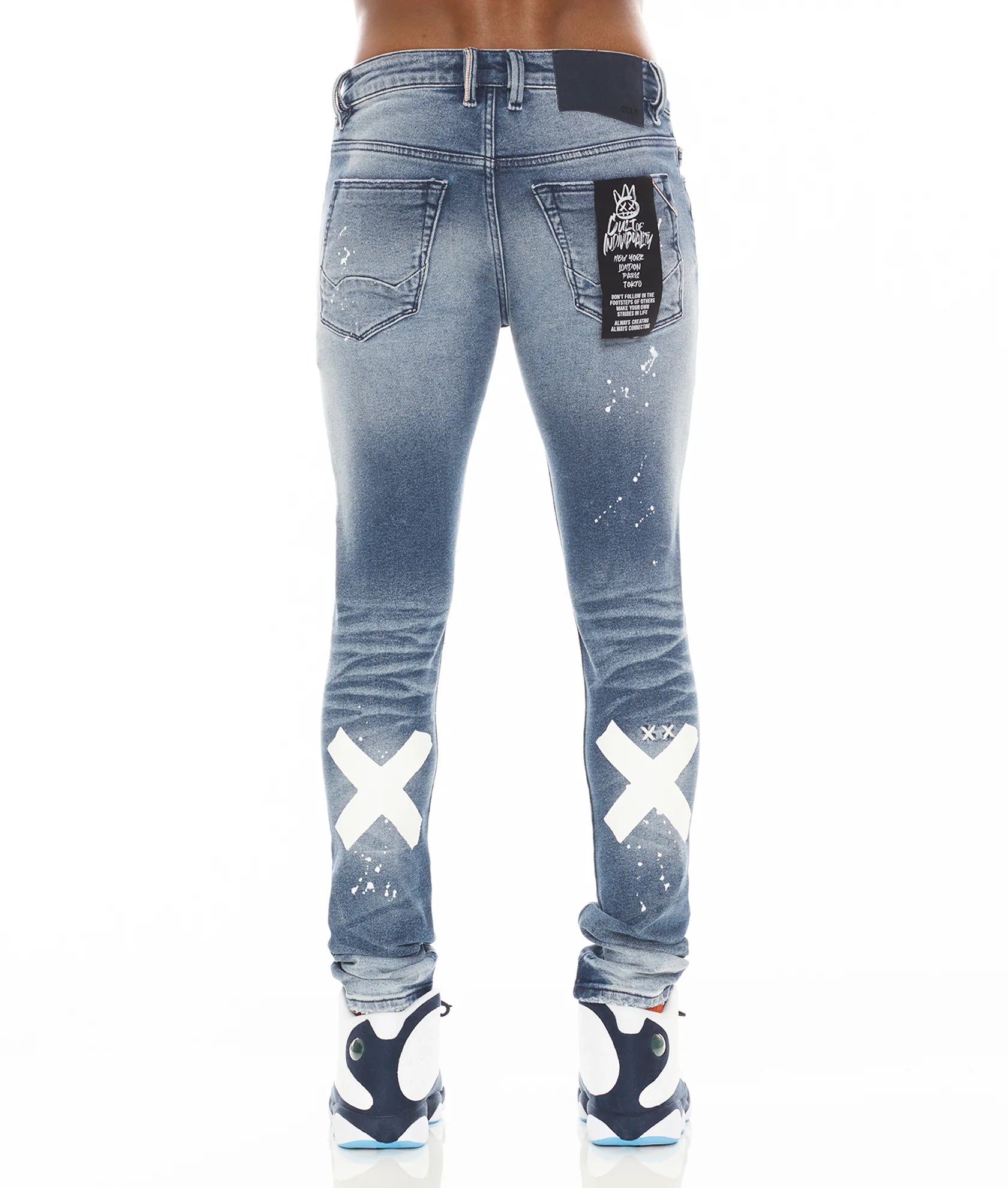 This medium blue stretch punk super skinny style has a narrow leg from thigh to ankle. This style is crafted from premium stretch denim and then vintage washed. This jean is embellished with paint splatter detailing and rip and repair for a unique look. Features print "xx" on back legs.