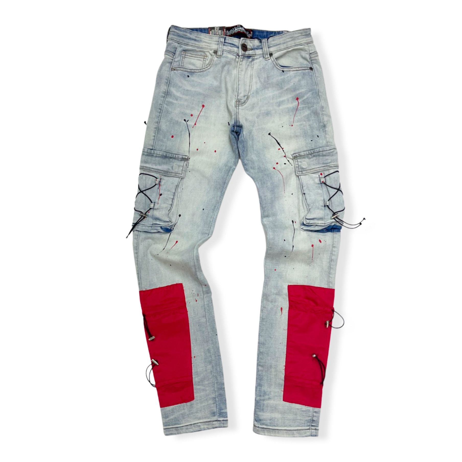 Denimicity (men’s light blue/red/black splash cargo jean) true fitted