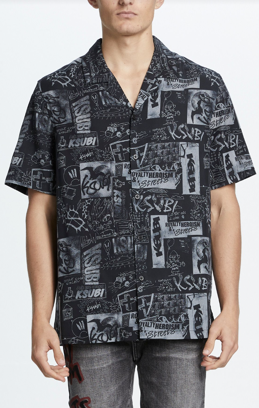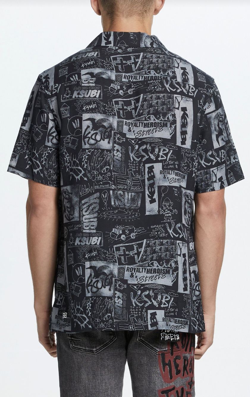 Relax fitted, short sleeve shirt with pressed open collar, front button closure and side seam split. Made from a premium Tencel blend with yardage printed original artwork. Features Ksubi branding.