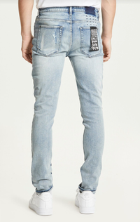 Skinny fit jean with a mid rise with unique angled belt loops and front fly seam. Made from a premium comfort stretch denim in vintage indigo with heavy stonewash and subtle whiskering and contrast wear. Features smash art print, decons with repair stitching, grinding, back 4x4 cross embroidery, Ksubi t-box printed branding, signature woven pocket flag and branded hardware.