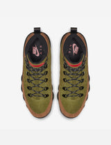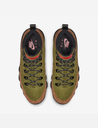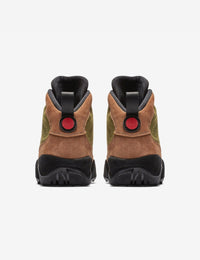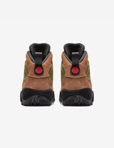 The Air Jordan 9 Retro Boot NRG 'Beef and Broccoli' gives a silhouette first seen in 1993 a look and feel made for inclement weather. Released in November 2018 and dressed in brown and olive, the boot features a suede upper, gusseted tongue, heel pull tab and Jordan signature details, the latter displayed in red. Equipped with water-resistant coating, rope laces and metal eyelets, the shoe's durable black outsole finishes the model.