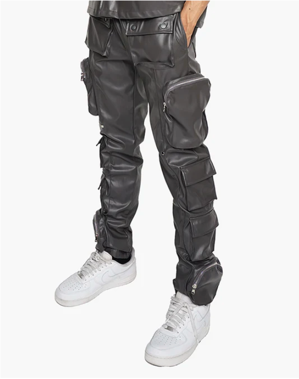The Saint Cargo Pants boast a relaxed skinny fit and are crafted from vegan leather fabric, offering both style and sustainability. These pants also come equipped with multiple cargo pockets for added functionality.