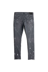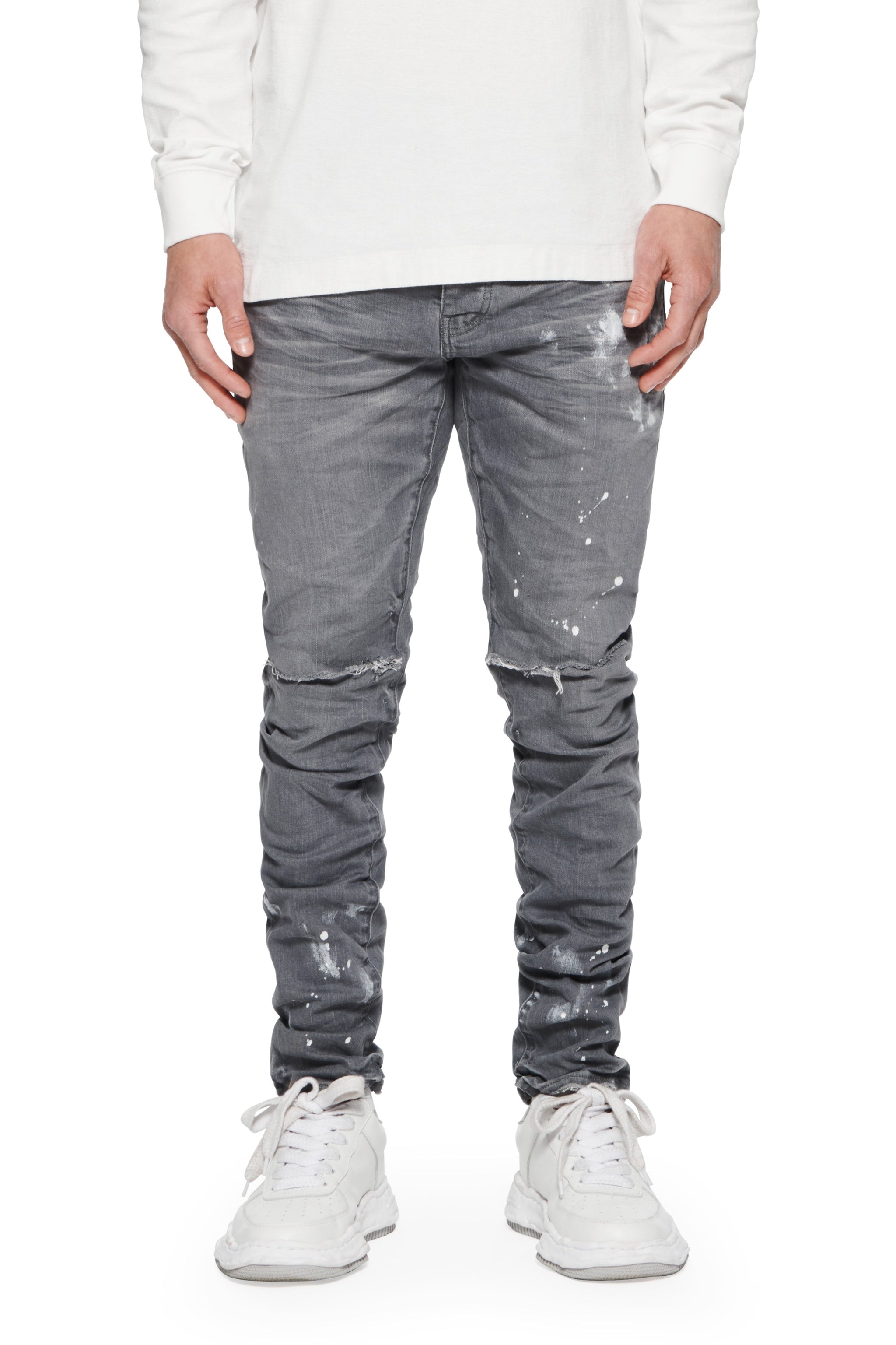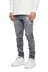 Constructed in a vintage grey wash, this elevated denim is designed with blowout detailing at the knee, hand-applied paint splatter, and a 3D wrinkle treatment for a distressed and vintage feel.