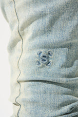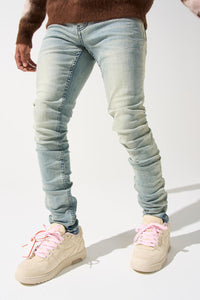 The "ESPRESSO" jeans feature a vintage earth wash with a skinny fit. Fading throughout. Five-pocket styling. Leather logo patch at back waistband. Zip-fly. Tonal stitching. 5 1/2" W leg opening. SERENEDE® branded button and rivet hardware.