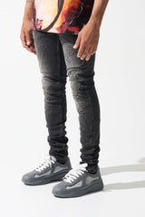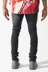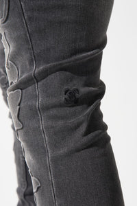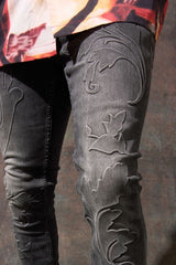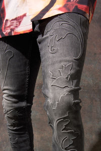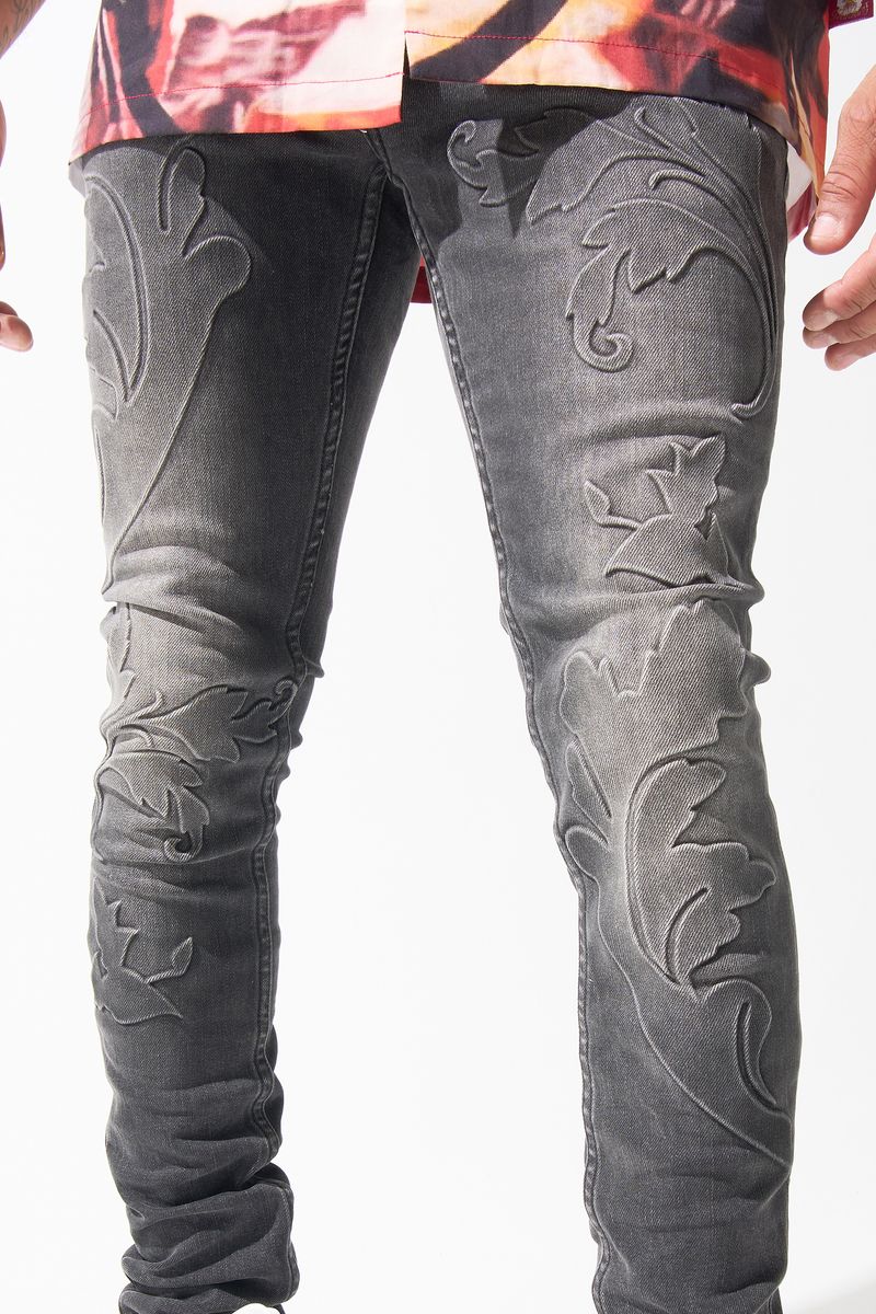 SERENEDE "ROME" jeans feature a washed black vintage wash with a skinny fit. Venetian grape debossed details over the front leg. Fading throughout. Five-pocket styling. Leather logo patch at back waistband. Zip-fly. Tonal stitching. 5 1/2" W leg opening. SERENEDE branded button and rivet hardware. 92% cotton | 6% polyester | 2% spandex Designed in California. Imported. The model is 5'4" ft, 140 Ibs wearing a size 28.